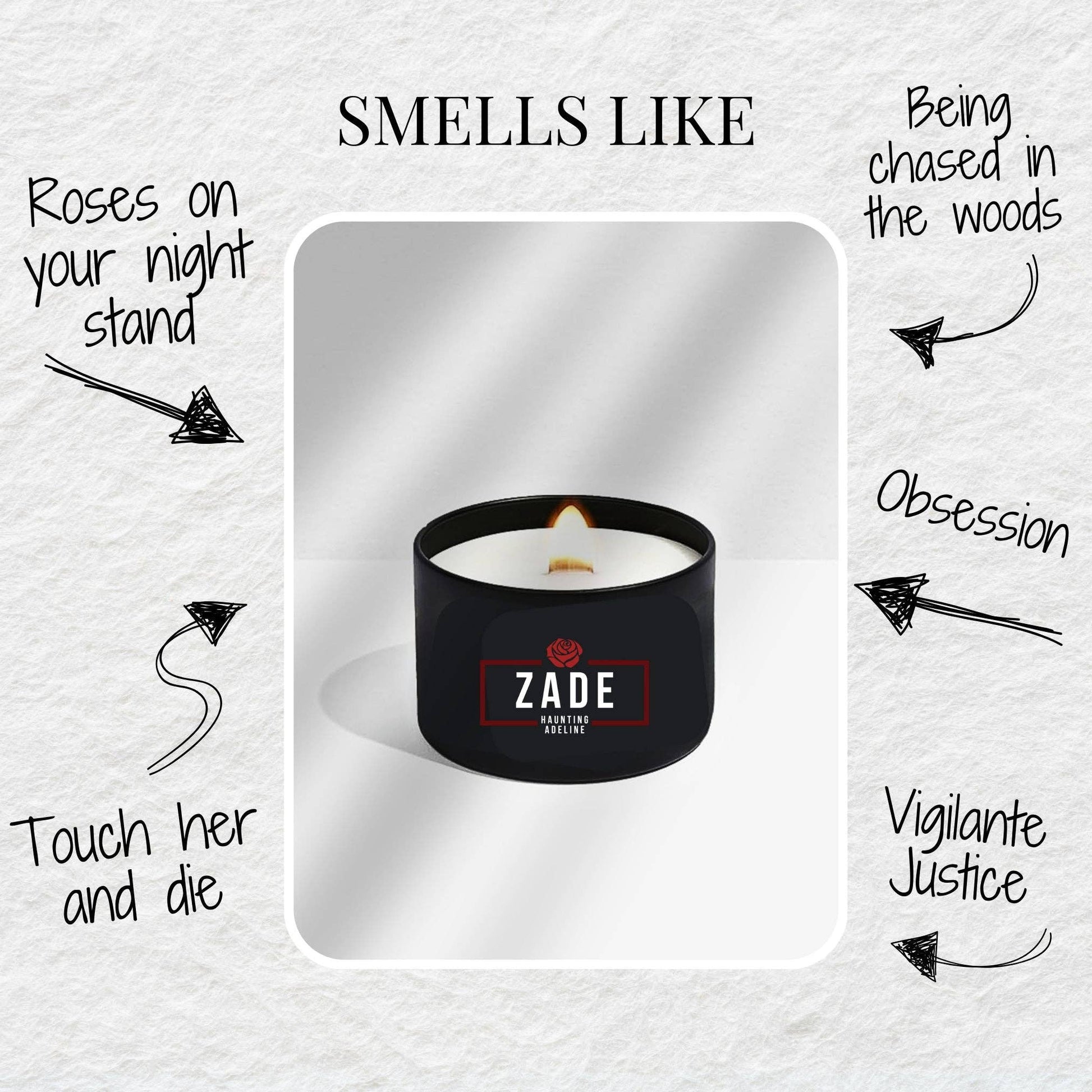 Inspired by Haunting Adeline and officially licensed by H.D. Carlton, this candle captures the intoxicating thrill of the hunt. It opens with a deceptively sweet mix of crisp rose, coconut, and ripe raspberry, luring you deeper into the shadows. As your heartbeat quickens, cedar and redwood emerge—dark, earthy, and all-consuming, like footsteps closing in behind you. Finally, tonka and vanilla wrap around you, warm and inescapable, leaving you breathless and utterly captivated.